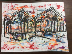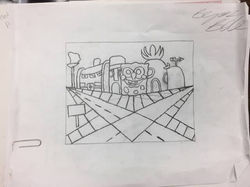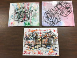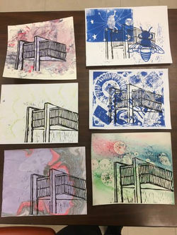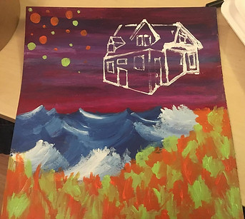 My work is a building floating in a surrealist landscape. That landscape is both a dark sky and a light ground. It gives the feel that it is both night and day. I wanted to make my print my house. My family loves to sail and be on the water so I placed the house by a body of water. I also used bright colors to show the happy memories I have in this home.The focal point of my artwork is the building, it being white really stands out. The way I achieved balance was will the repeating colors in the corners of the piece. My work reflects the work of Bobby Hill. He works in bright colors and bold colors for this prints. I used that as inspiration for my work.